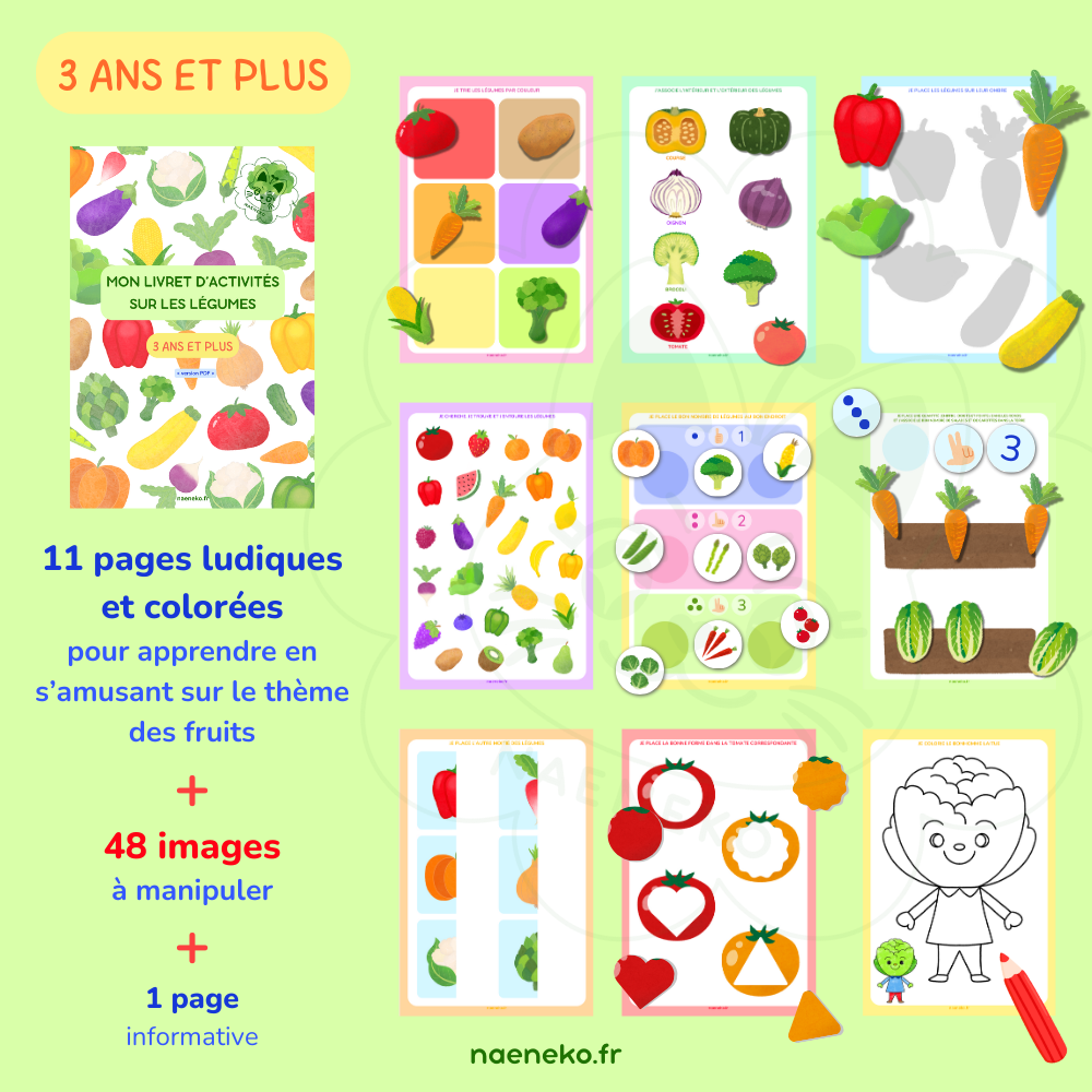 Un livret d’activités pédagogiques sur le thème des légumes « 3 ans et plus » contient des activités ludiques et colorées. 🥦🥕🍅