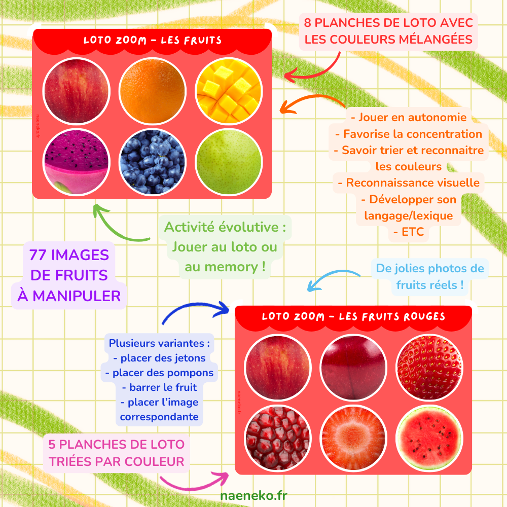 Ce support pédagogique se compose 13 planches de loto et de 77 photos de fleurs à manipuler ! ✨🍓🍋🥝